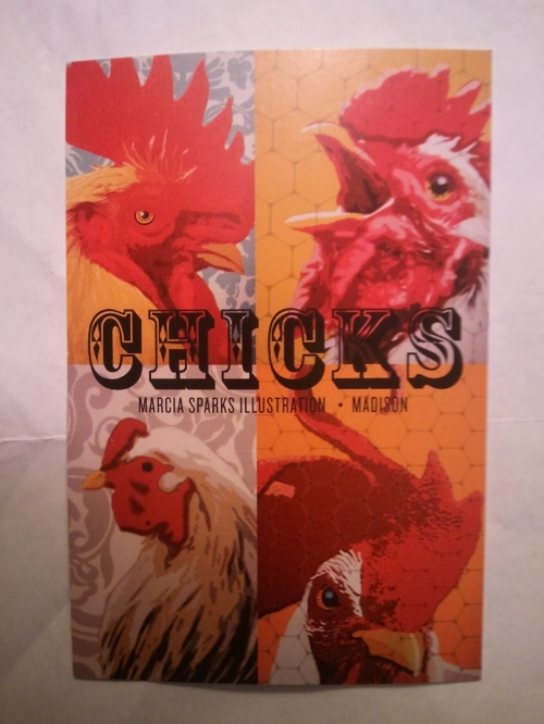 This postcard advertises “Zip-dang The Handmade Menagerie” 2606 Monroe St, Madison Wisconsin (www.zip-dang.com). The illustration by Marcia Sparks on canvas is called “Chicks” if I read it right.
