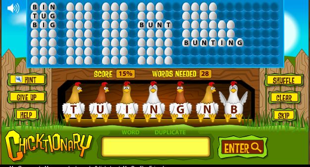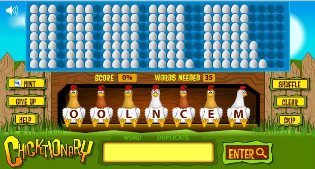 It is an anagram, word extraction type game. You create words from the letters you are given and the score/words are kept on the egg rows. It has a completely over the top twangy theme song and then the sound effects kill me. 🙂 Also, the chickens don’t sit still while they wait for you to type out the words you find.