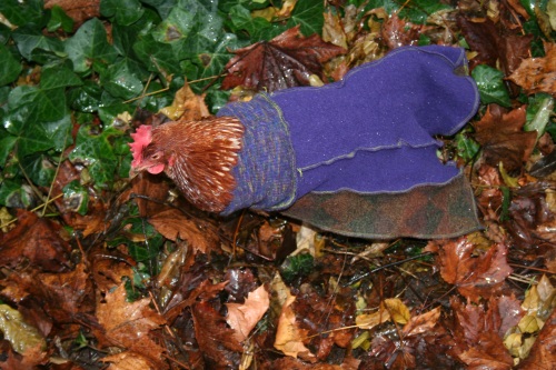 I tossed the garment into the trash. Next up might be “tube with wing slits.” But, I’m not sure. Mother Nature intended chickens to run naked and we may be messing with vital supernatural forces here if we taunt the powers that be too much with chicken sweaters.