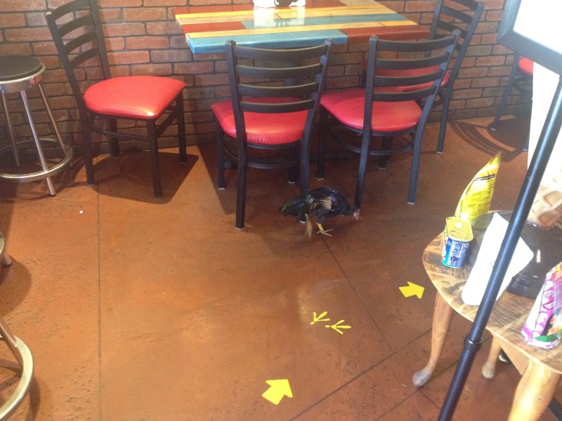 An ice cream store with a resident chicken that transits the floor looking for leftovers: